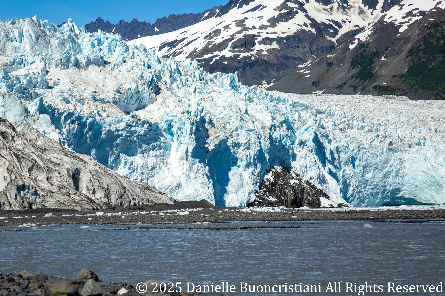 We stopped below the glacier for lunch. A braided river ran down from the mountains beside us, carrying glacial silt and ice into the bay. You could feel the chill coming off the glacier even in the sunlight.